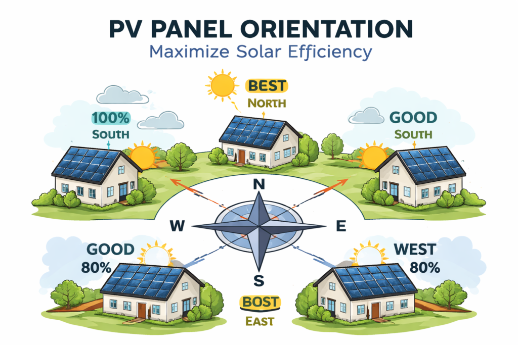 It is better to reduce the loss of cosine in angled rays. Nevertheless, east-west orientation of solar panels produces 70-85% of optimum, which would be suitable for time-of-use tariffs, whereas the north-west (315 deg) orientation of solar panels aligns the afternoon peaks with 85-90% efficiency.