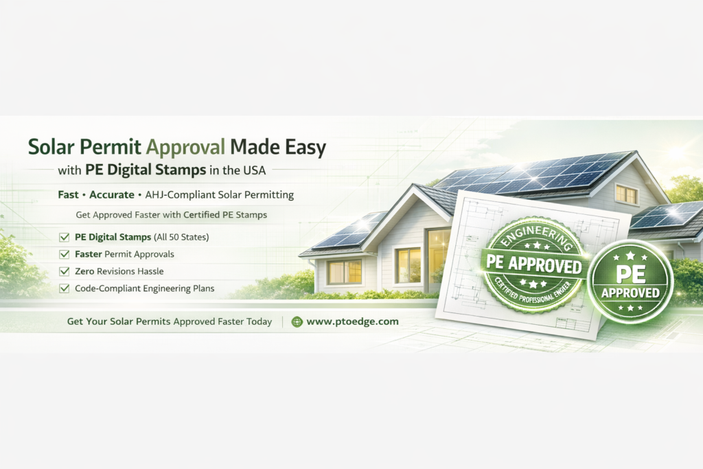 The solar projects in the USA are allowed and approved as per a legal system. In California and in Texas, local authorities with jurisdiction (AHJs) require solar plan sets to be signed and sealed by a licensed Professional Engineer (PE). This is where PE digital stamps come in and why PTOEdge has become a go-to provider of fast, reliable PE stamping services for solar installers and EPCs nationwide.